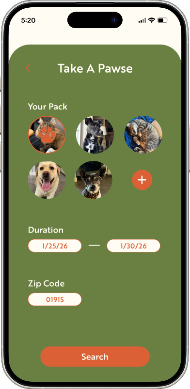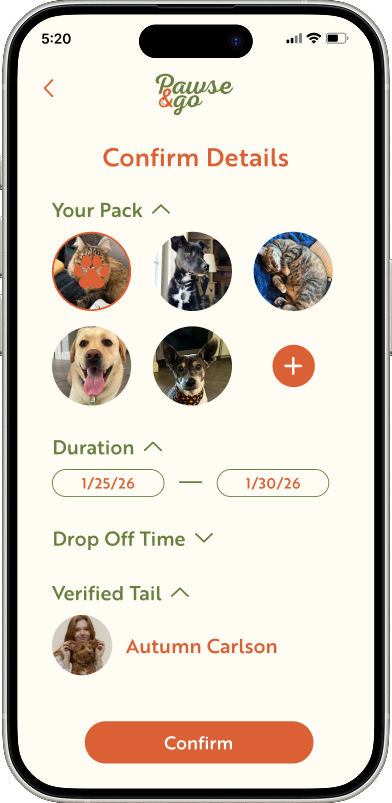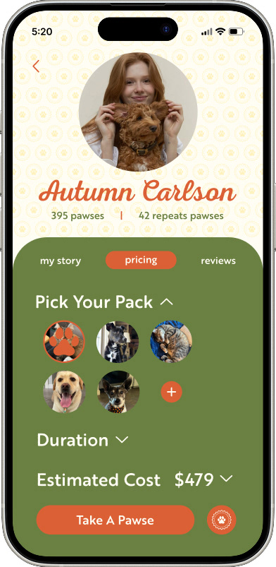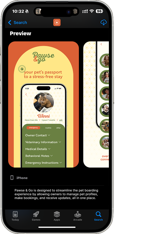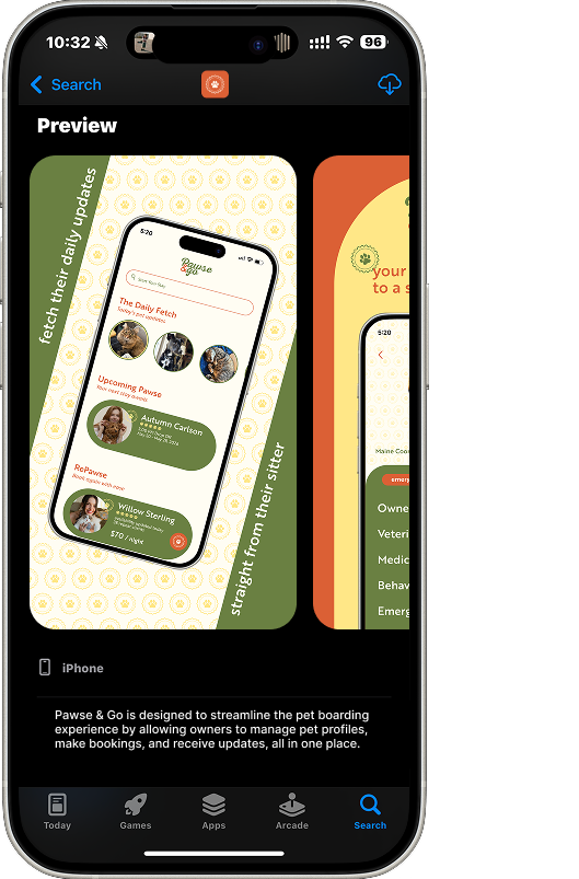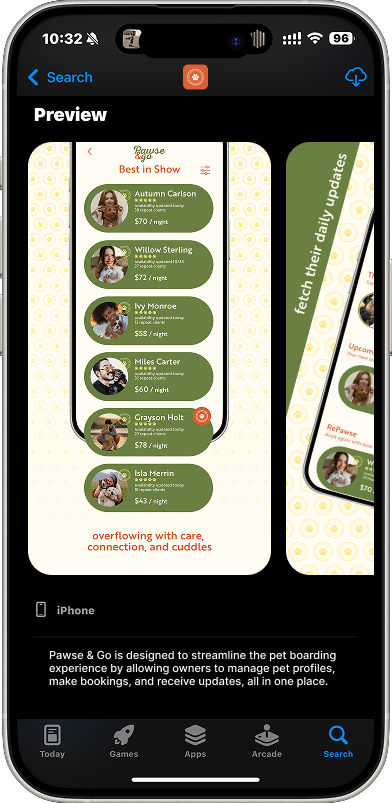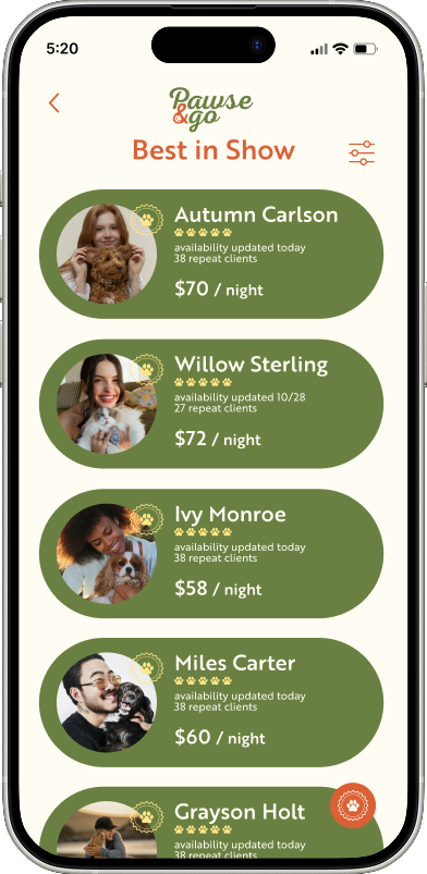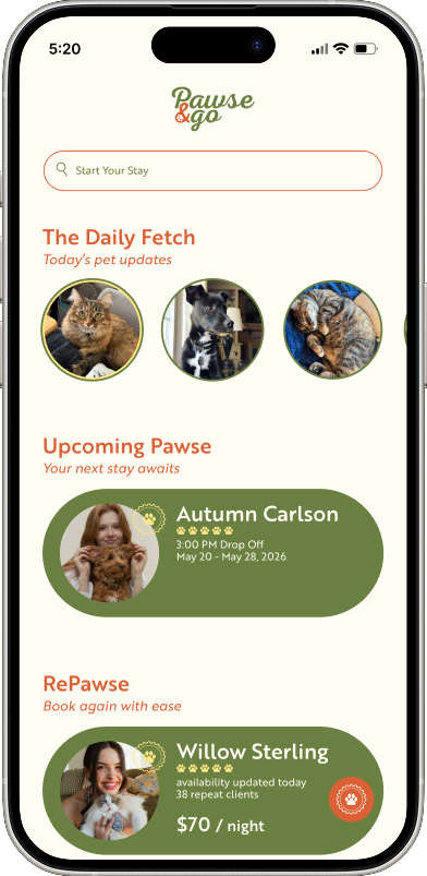 Pawse & Go is a mobile app concept designed to simplify the process of finding and booking trusted pet boarding services. The project focused on creating a warm, fun, and inviting user experience that reflects the comfort and care pet owners look for when leaving their pets with someone new. Designed in Figma, the app features an intuitive interface and unique navigation elements to make browsing, booking, and managing pet stays simple and engaging.